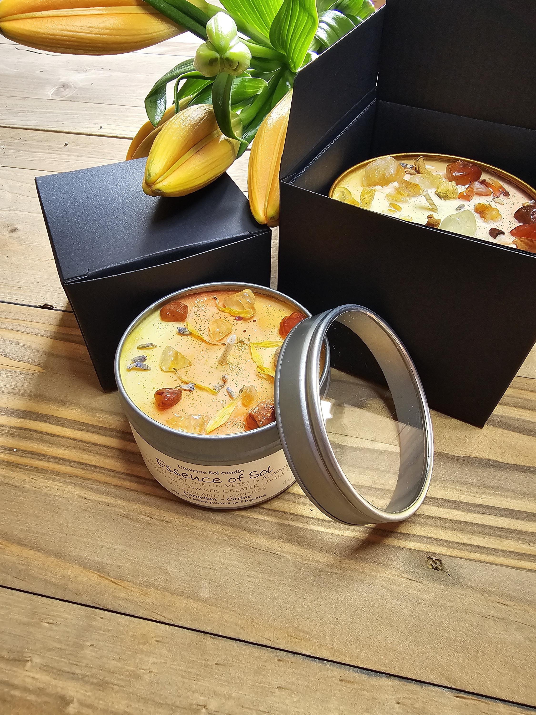 The ESSENCE OF SOL manifestation candle is a powerful combination of Carnelian and Citrine crystals infused with essential oils.