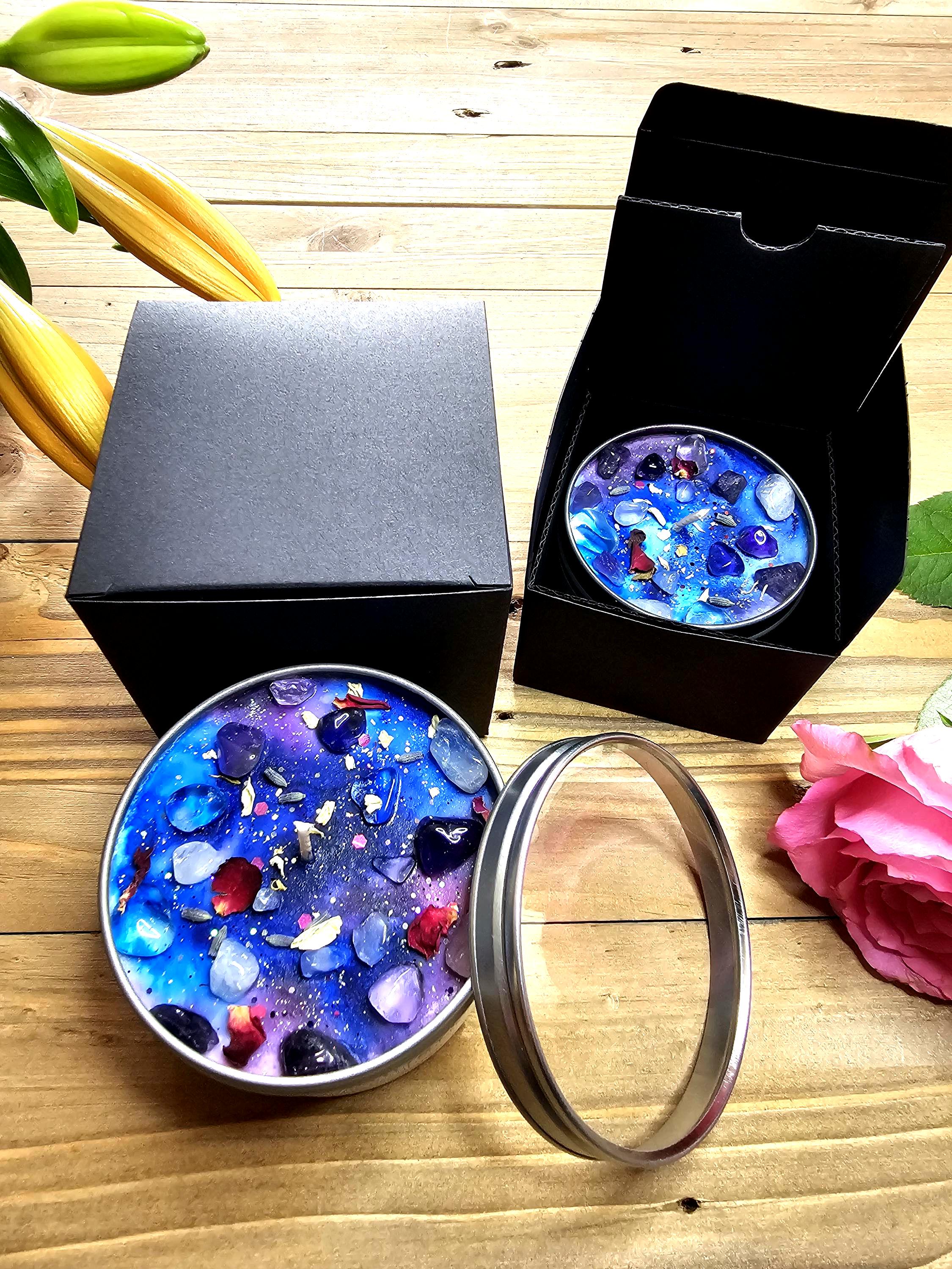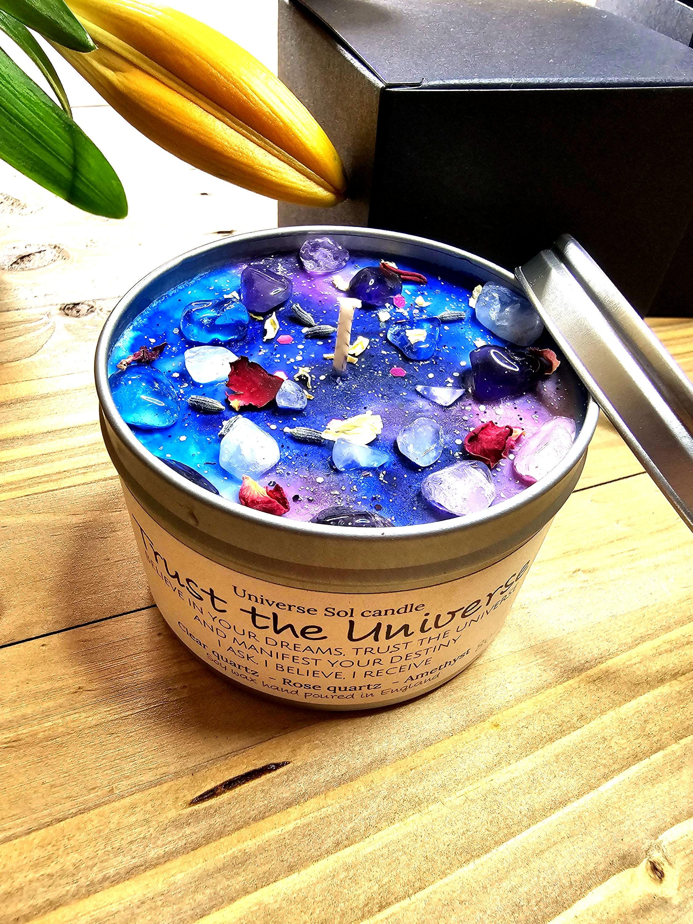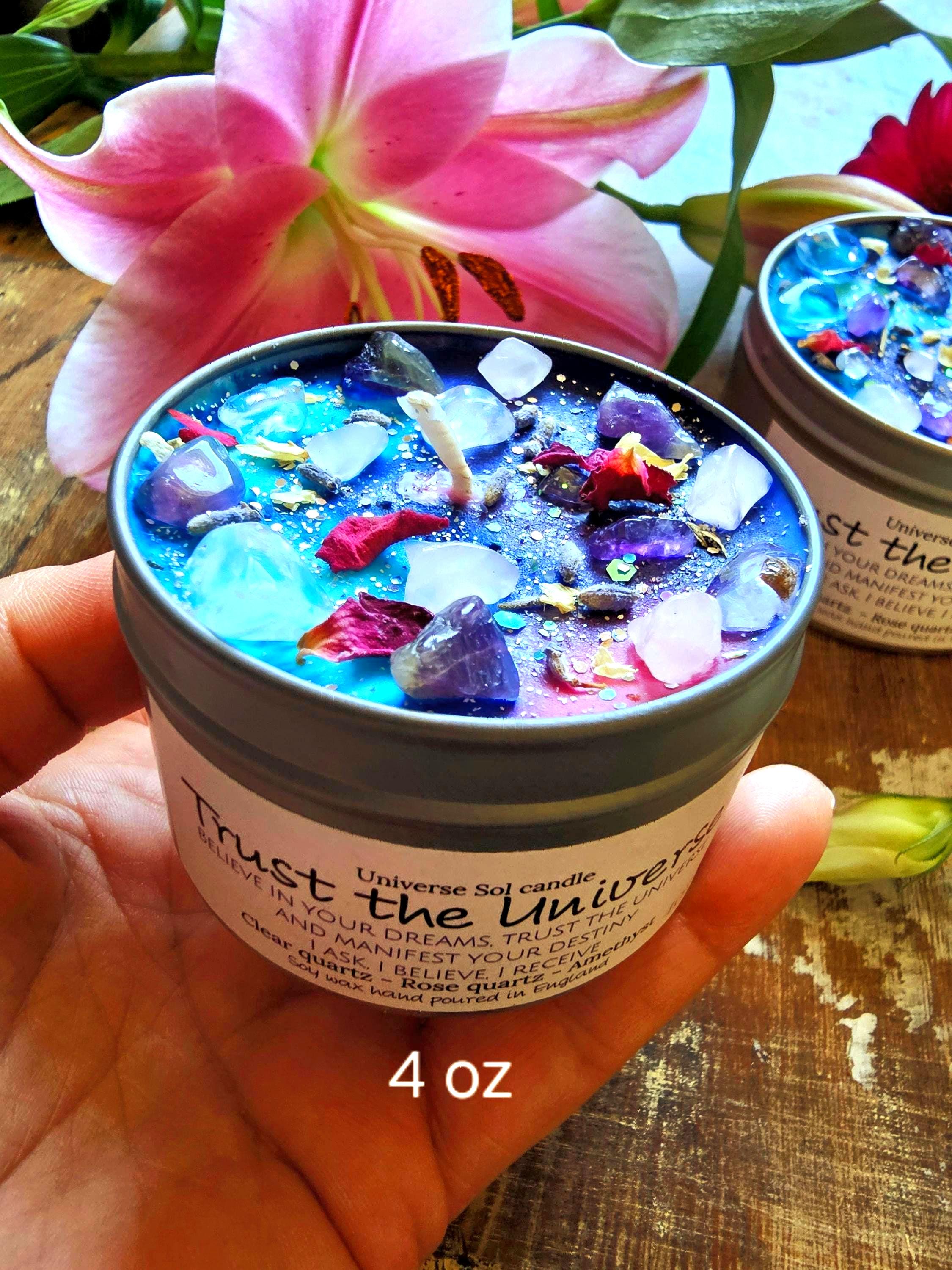 The TRUST THE UNIVERSE manifestation candle is a powerful combination of Rose Quartz, Clear Quartz and Amethyst crystals  infused with fragrance oils and beautifully hand decorated with dried rose petals, Jasmine.