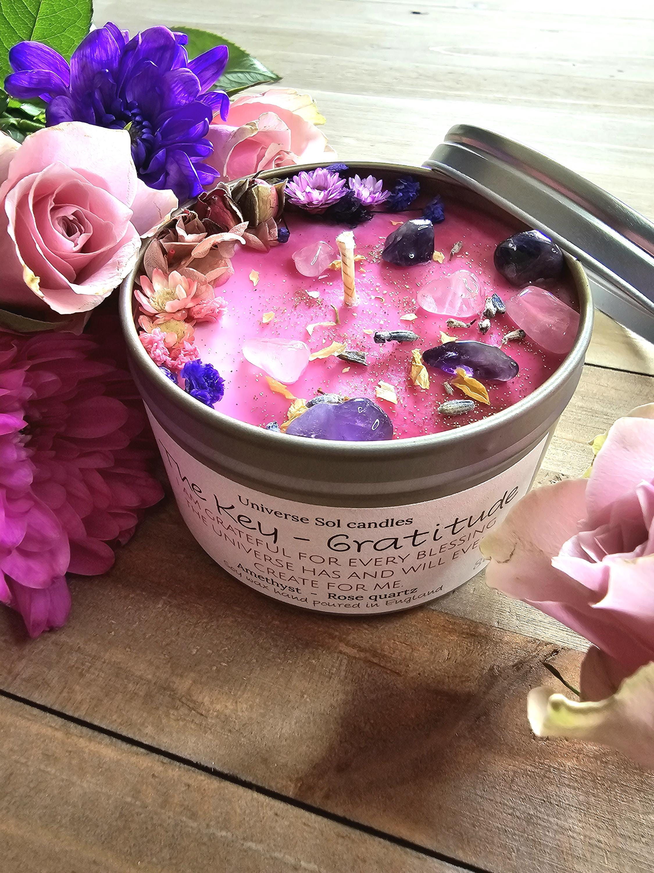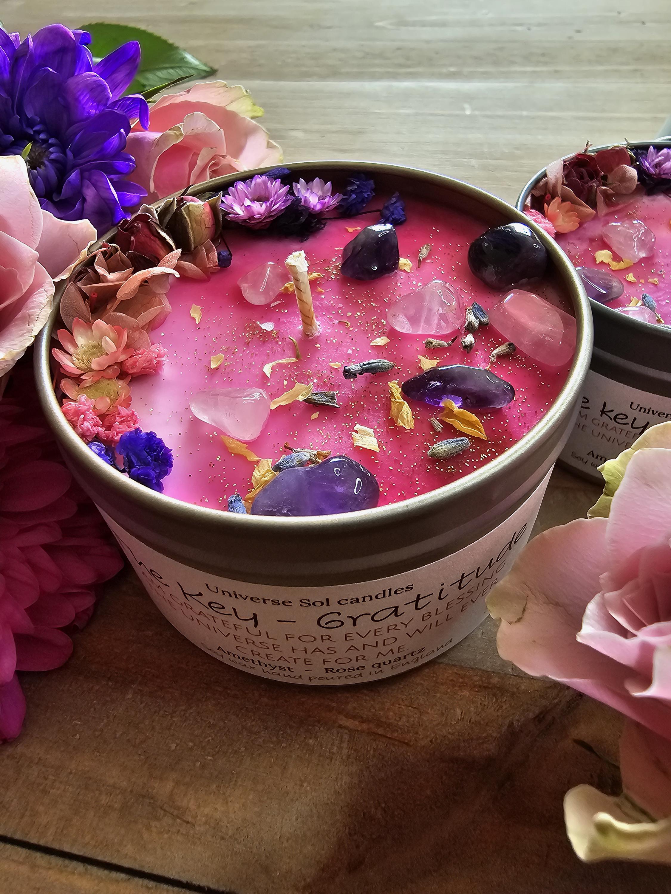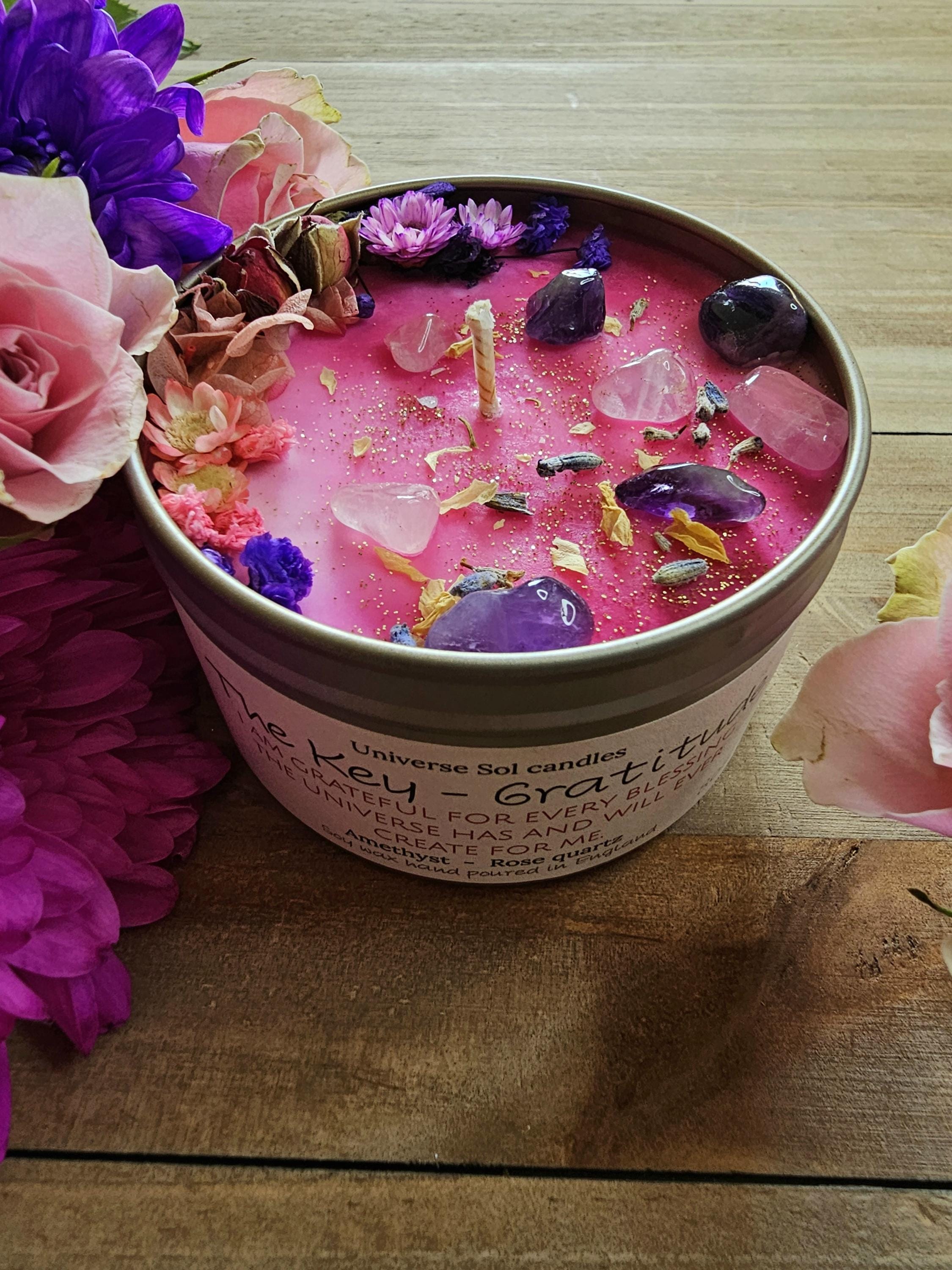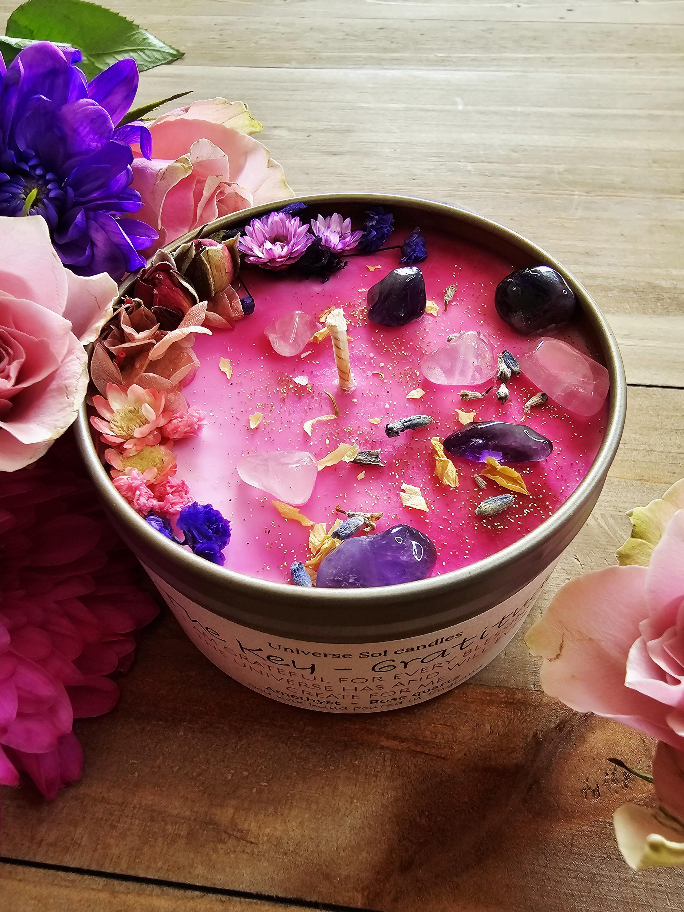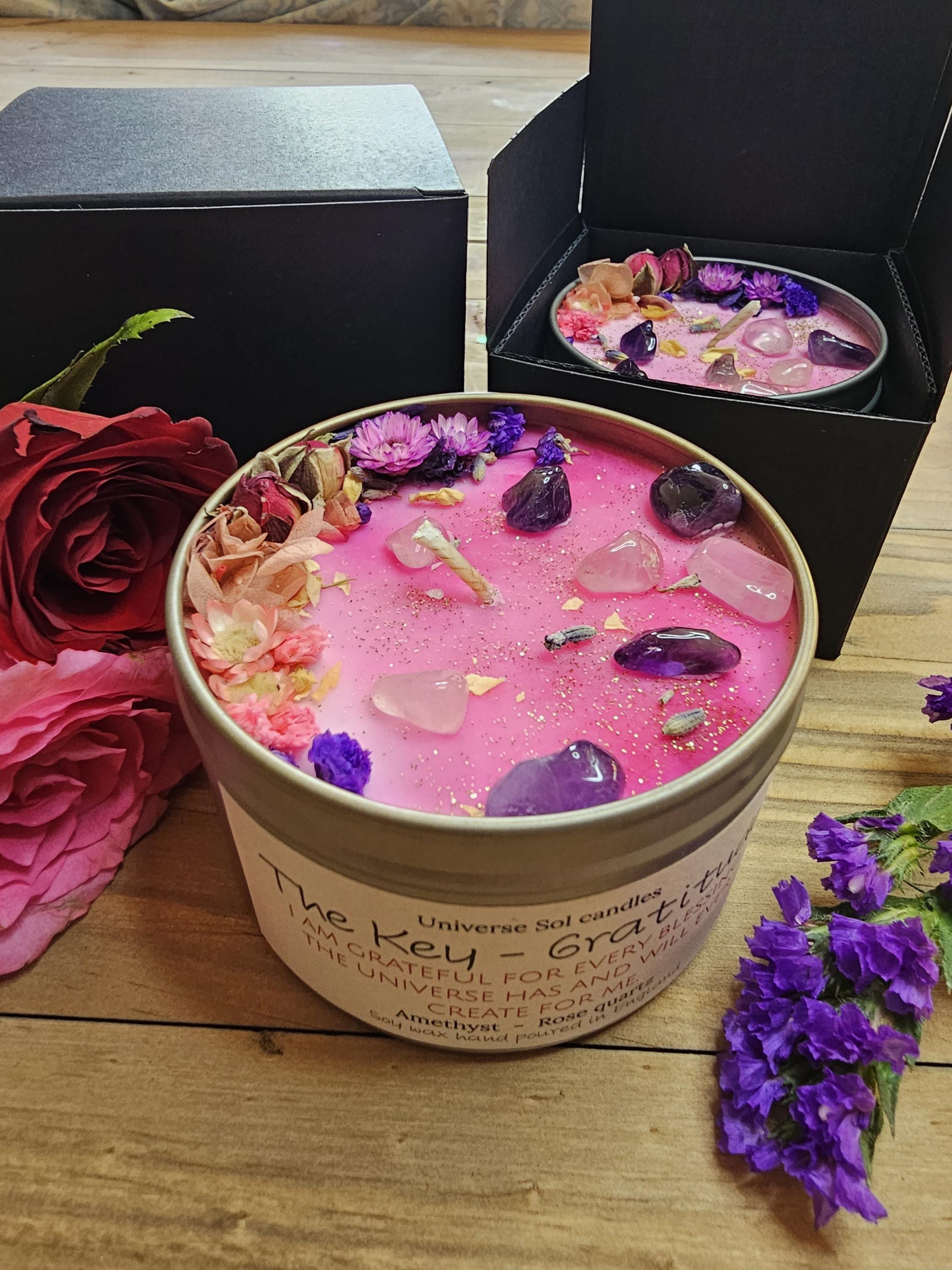 The KEY- GRATITUDE manifestation candle is a powerful combination of Rose Quartz and Amethyst crystals infused with essential oils and beautifully hand decorated with dried flowers.