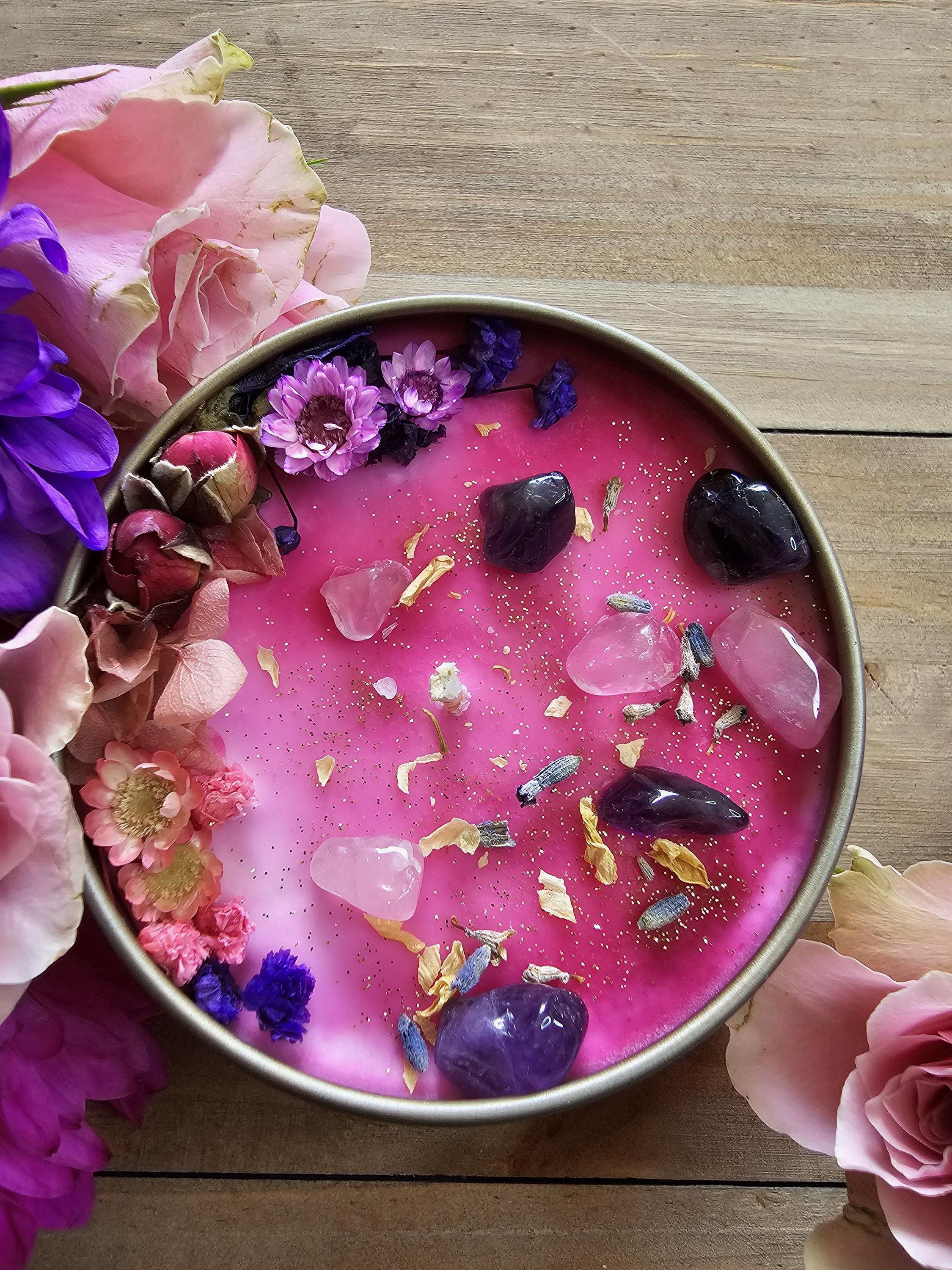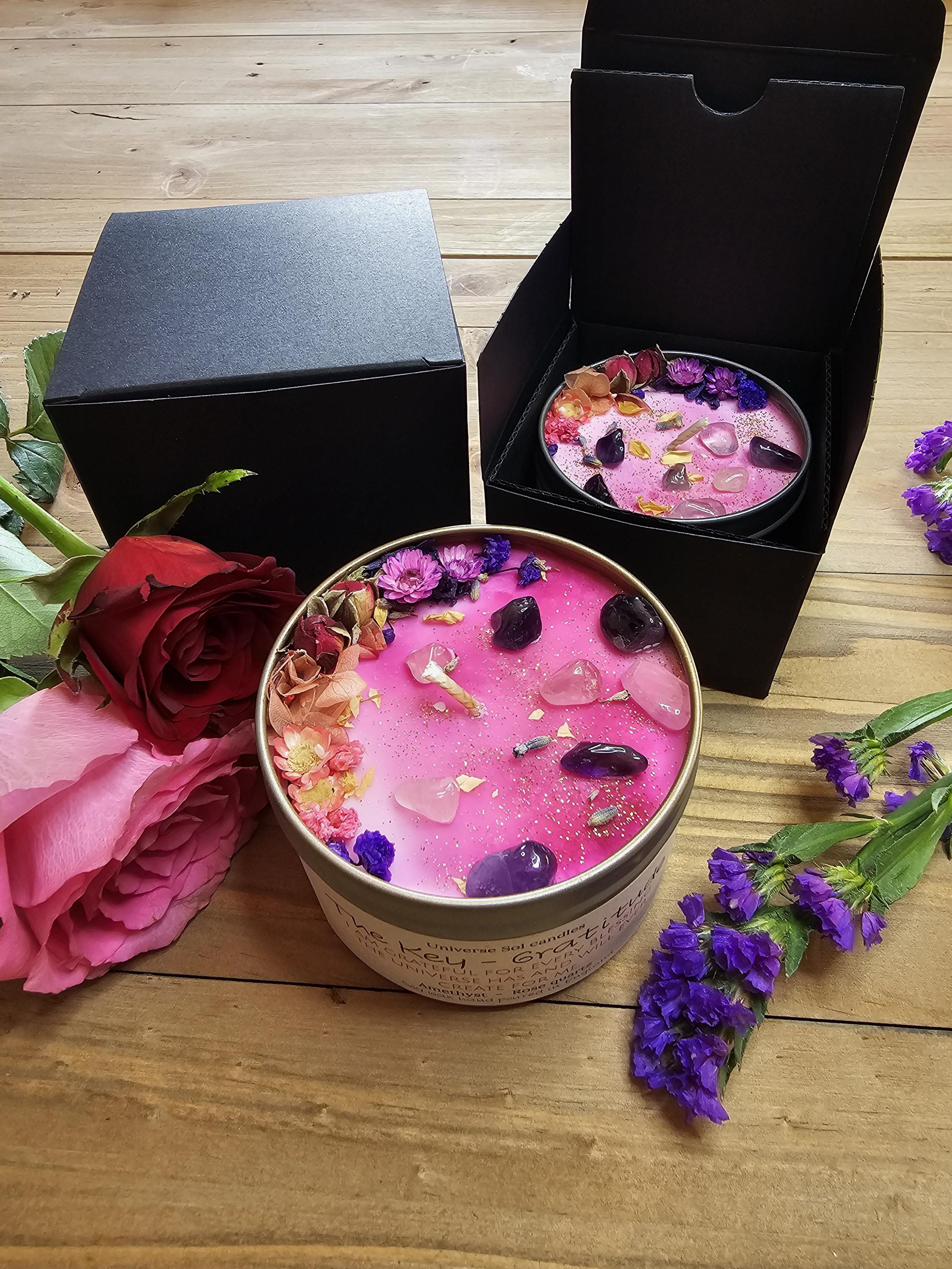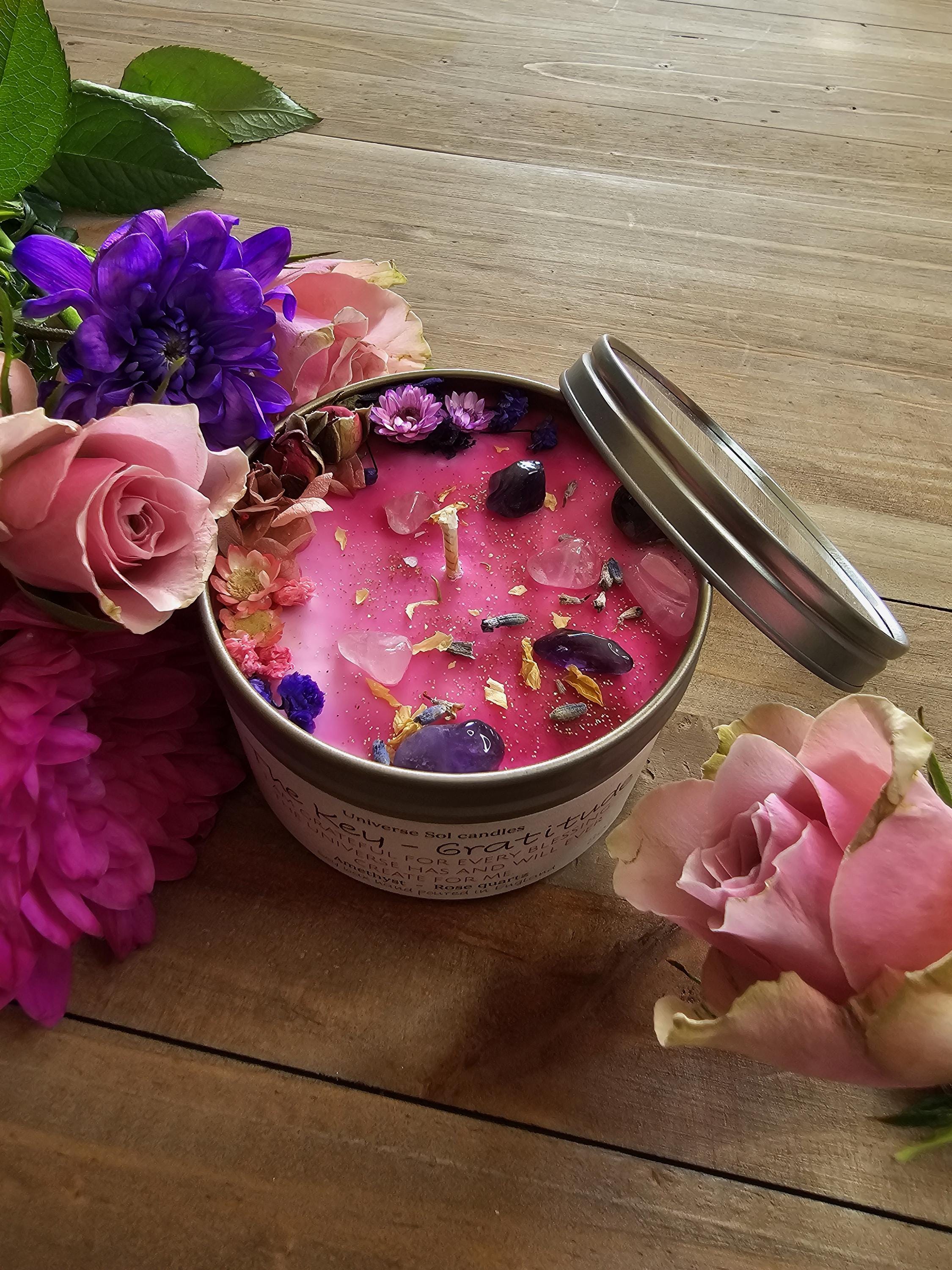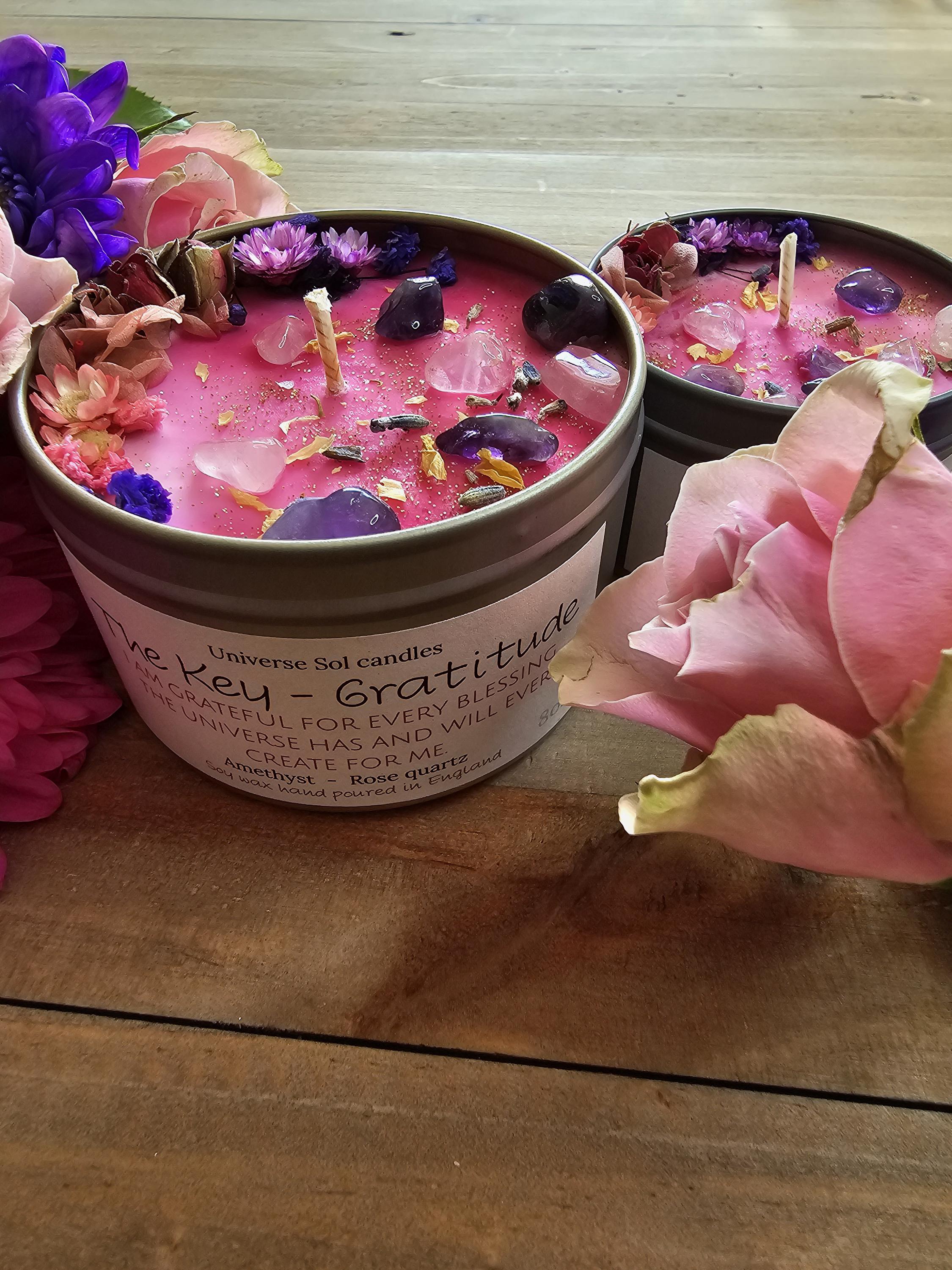 The KEY- GRATITUDE manifestation candle is a powerful combination of Rose Quartz and Amethyst crystals infused with essential oils and beautifully hand decorated with dried flowers.
