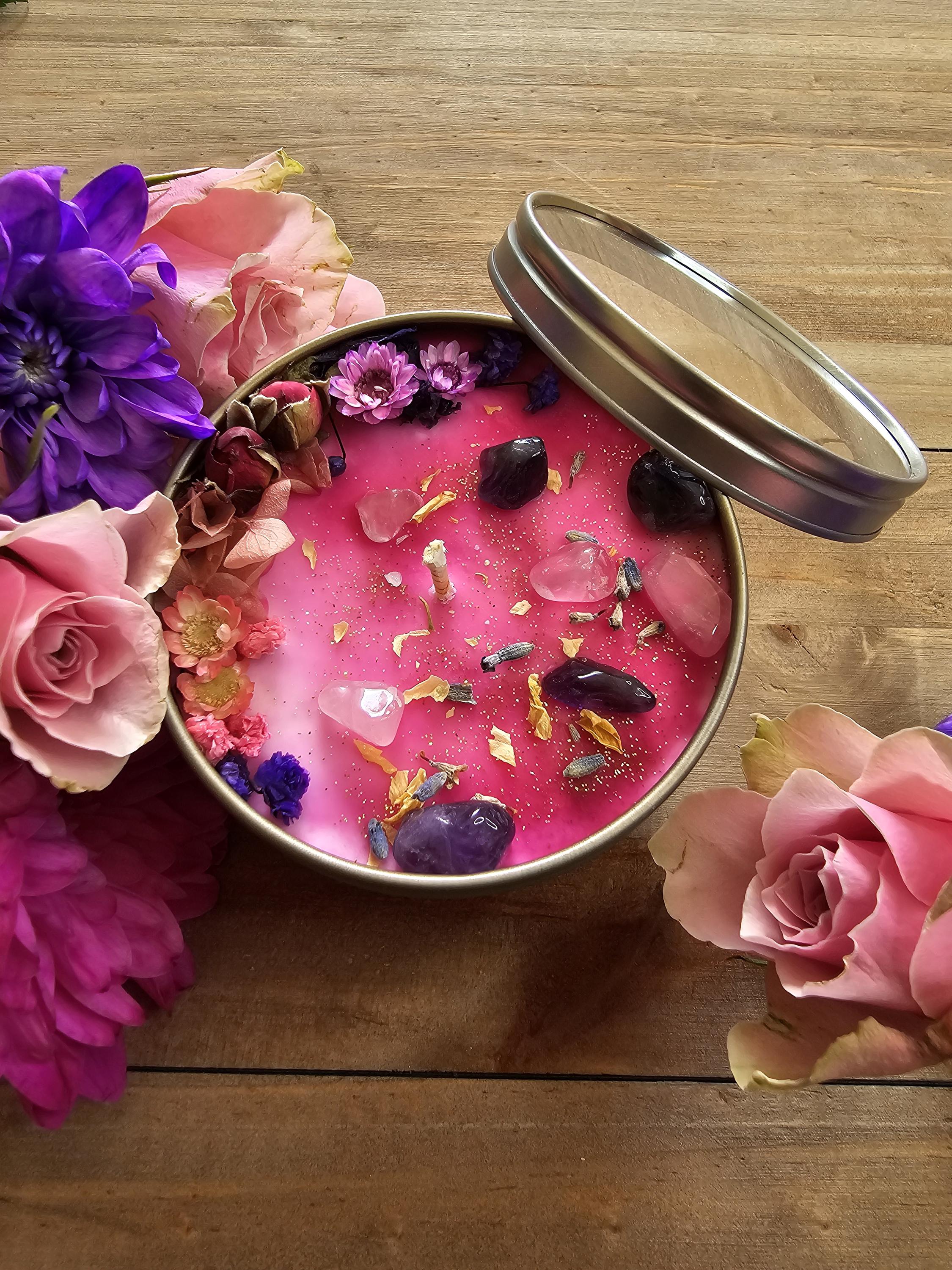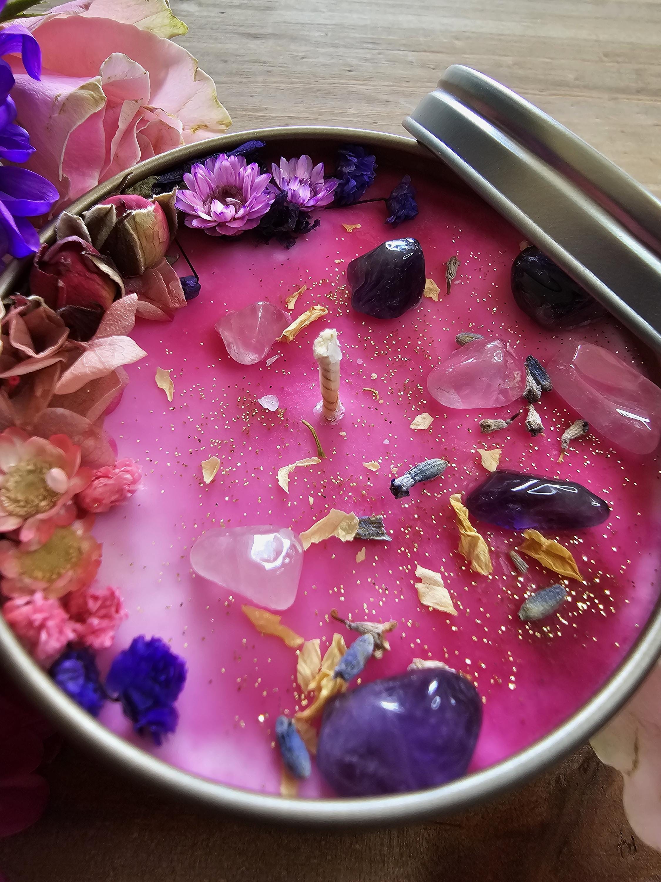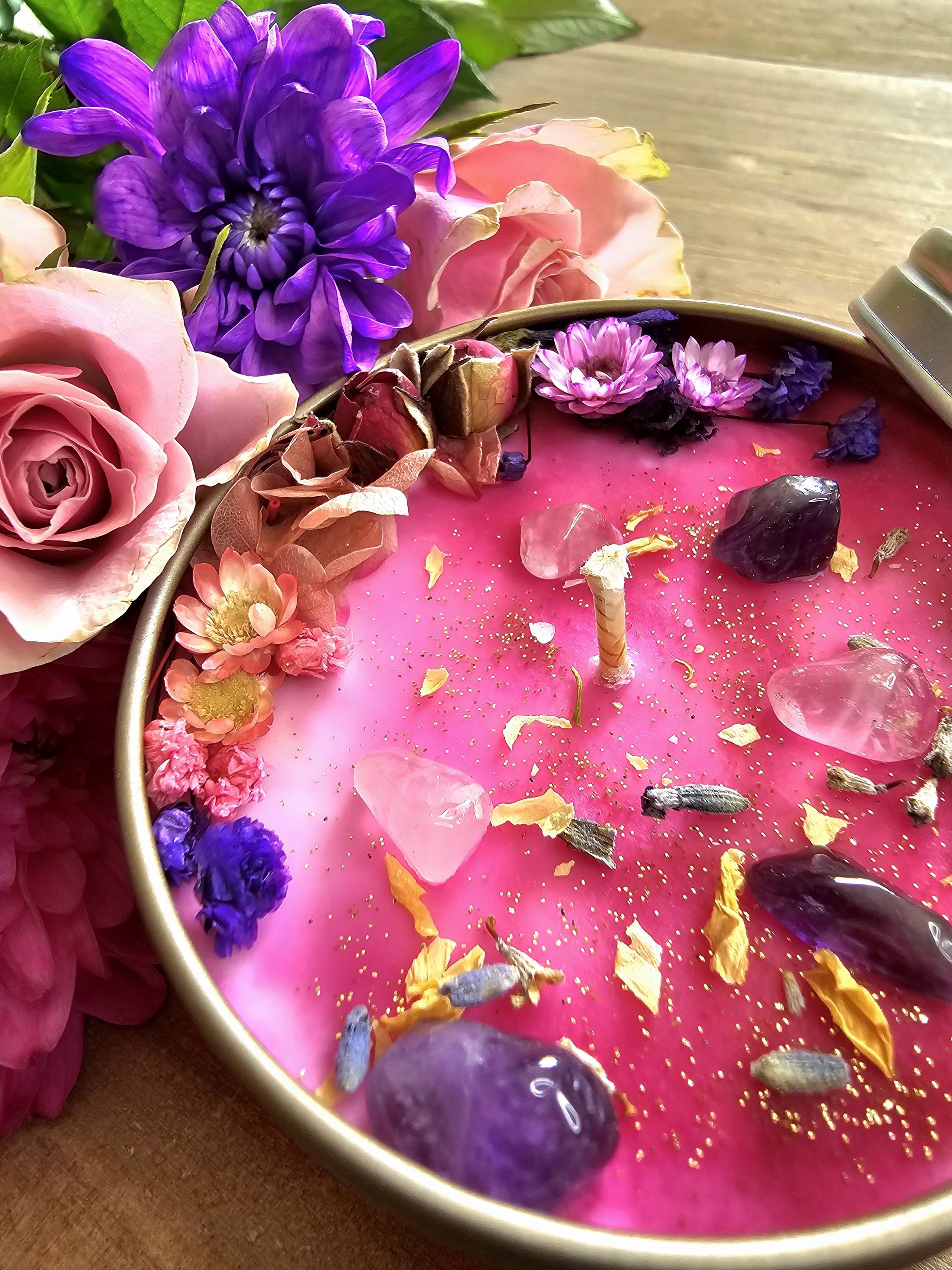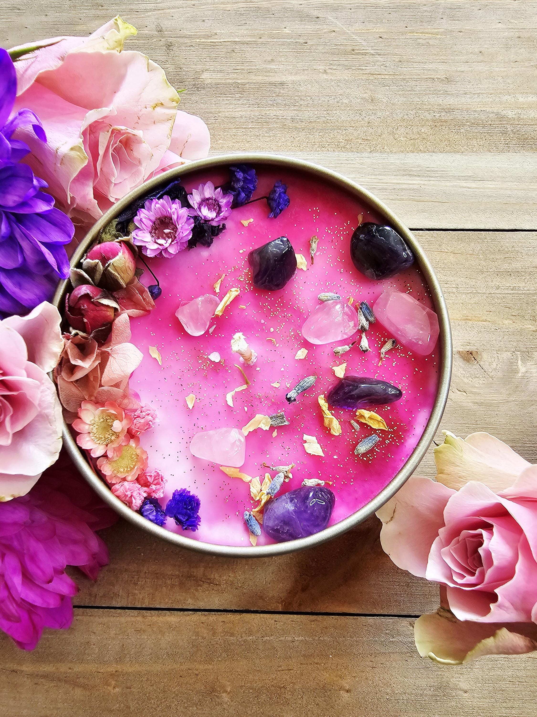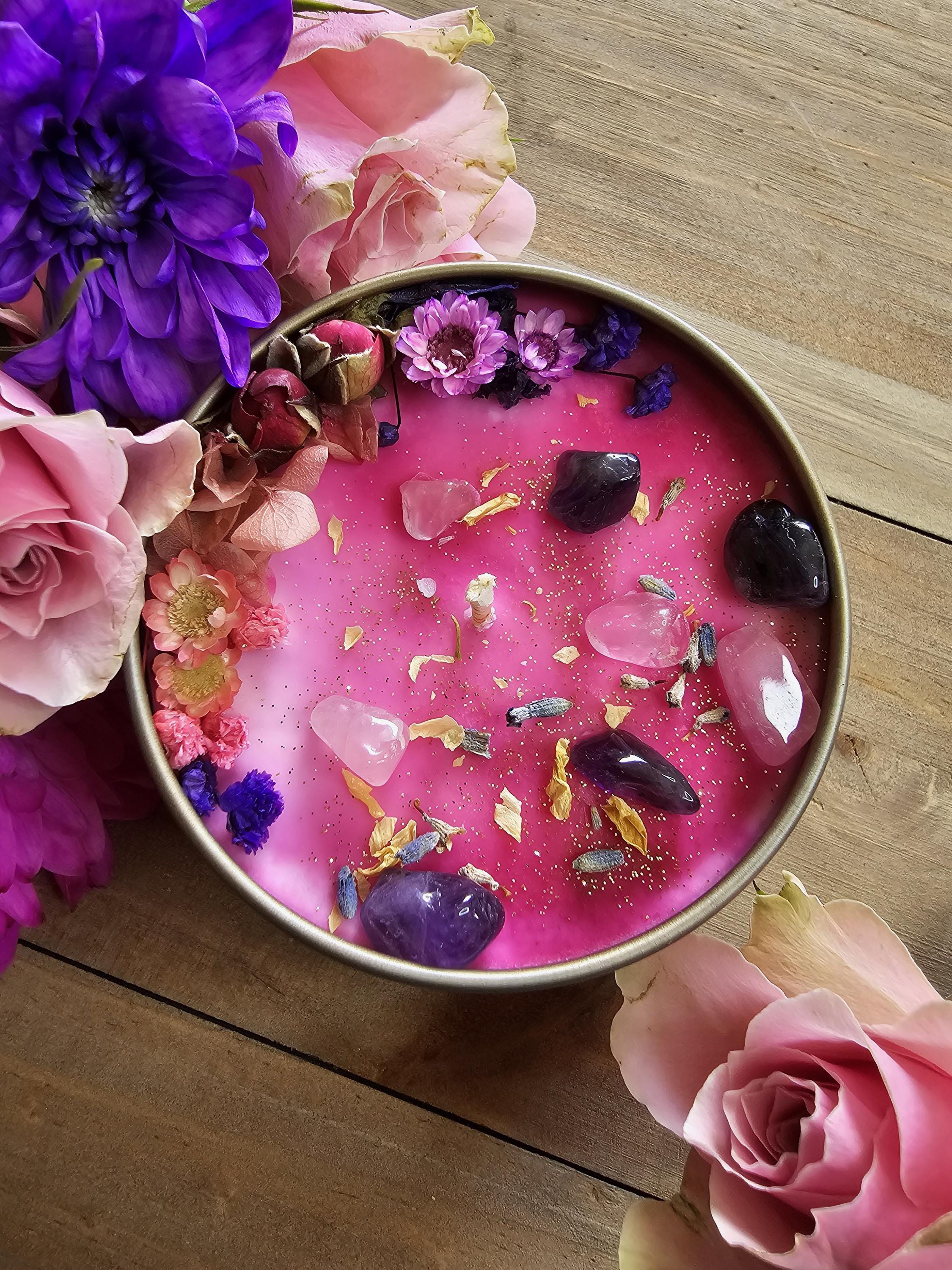 The KEY- GRATITUDE manifestation candle is a powerful combination of Rose Quartz and Amethyst crystals infused with essential oils and beautifully hand decorated with dried flowers.