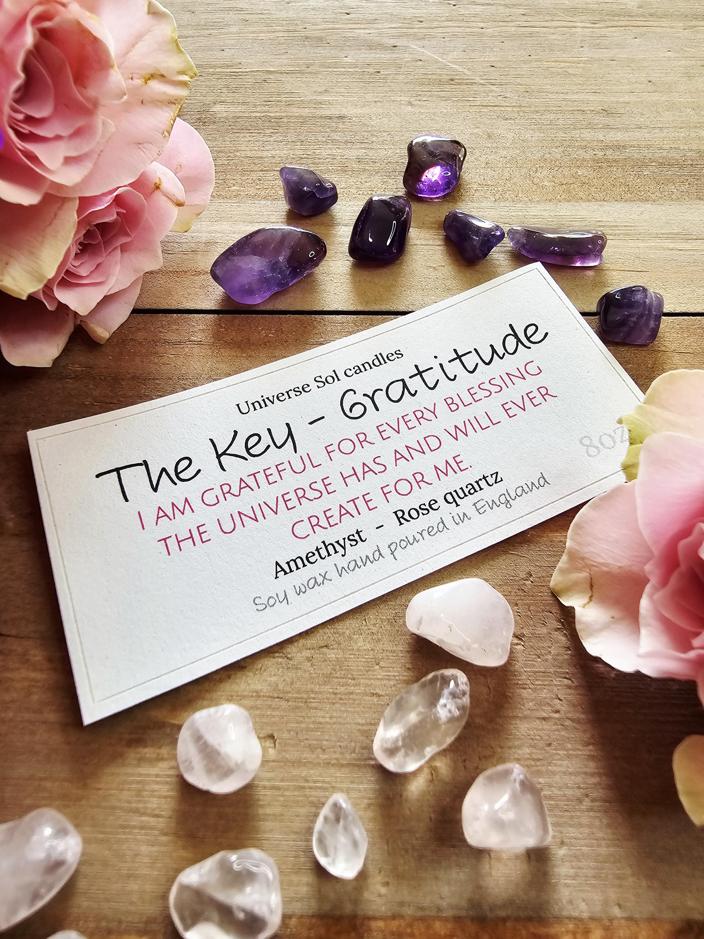 Gratitude Crystal Candle: Rose Quartz, Amethyst, Floral Scent | The Key - Gratitude