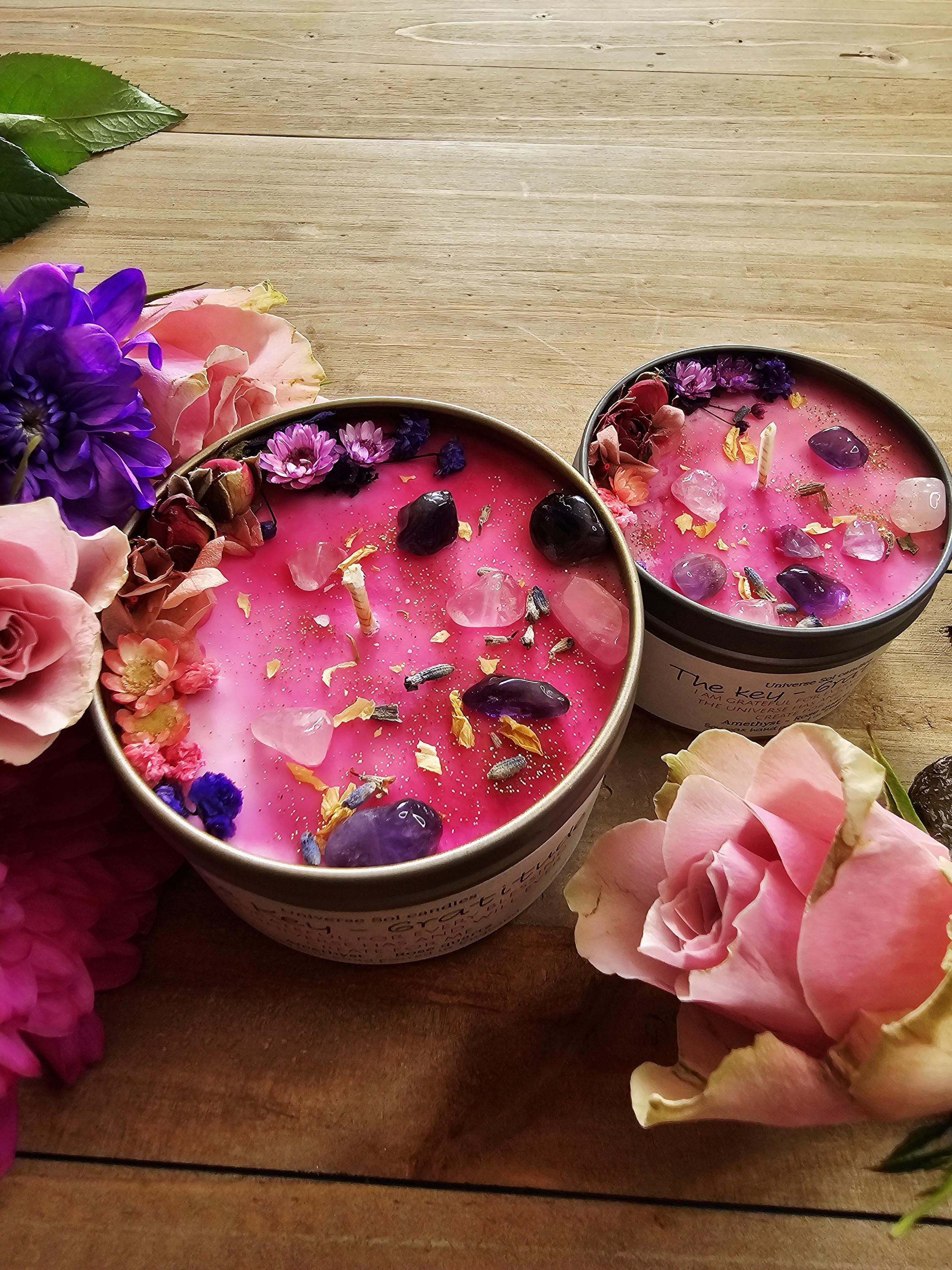 Universe Sol Candles are all handmade in Yorkshire with vegan soy wax, pure essential oils and carefully chosen crystals,  paired with affirming words to create a powerful manifestation candle.